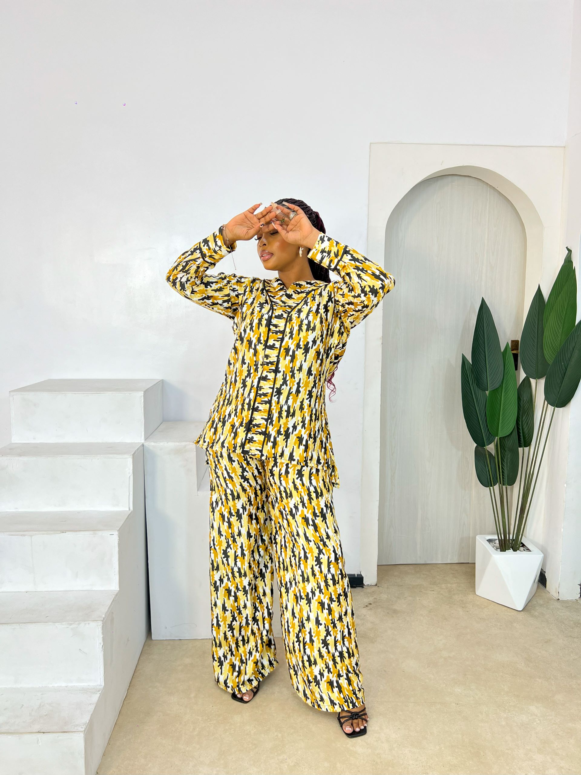 ACCRA SET is a striking fusion of heritage and futurism, where classic pattern meets contemporary edge. The bold geometry of houndstooth reimagined in vibrant yellow, stark black, and crisp white creates a rhythmic pulse across the fabric, like visual poetry in motion. Each line and angle speaks of precision, yet the overall silhouette flows with effortless grace.
