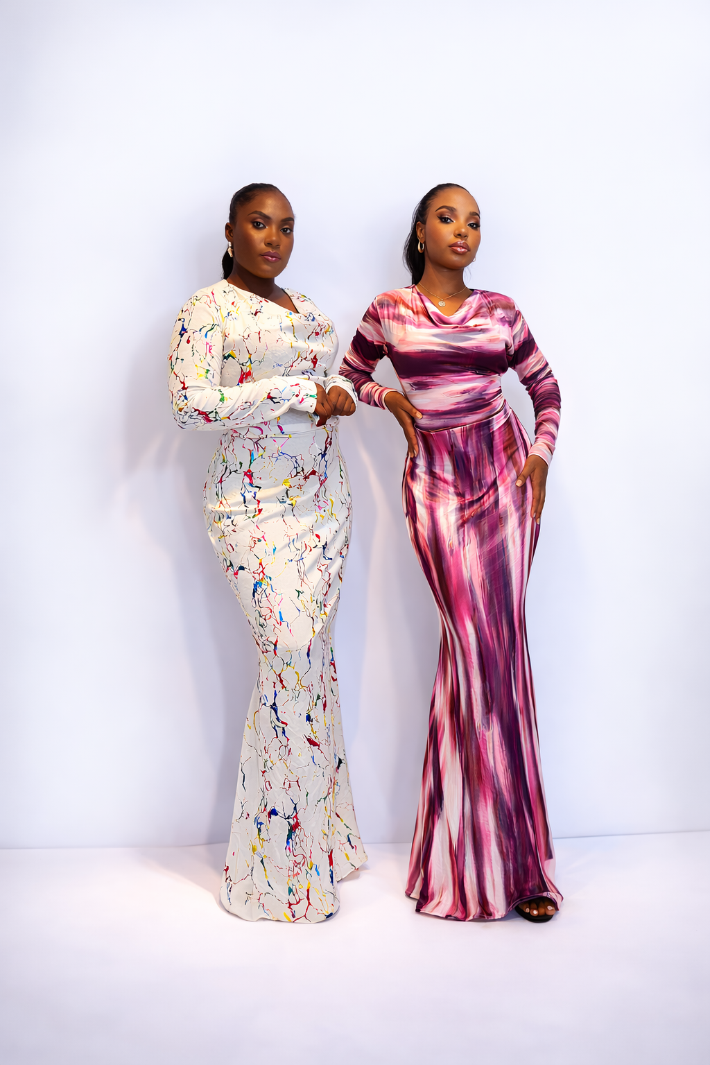 The ADIA Dress is a celebration of individuality and visual storytelling. Crafted in soft stretch fabric with expressive abstract prints, each dress offers a distinct perspective. The front-facing piece features a swirl of pink, purple, and white with a cowl neckline and long sleeves evoking softness and flow. The back-facing ensemble contrasts with a crisp white base splashed in multicolor strokes, cinched at the waist with a belt for structured grace.