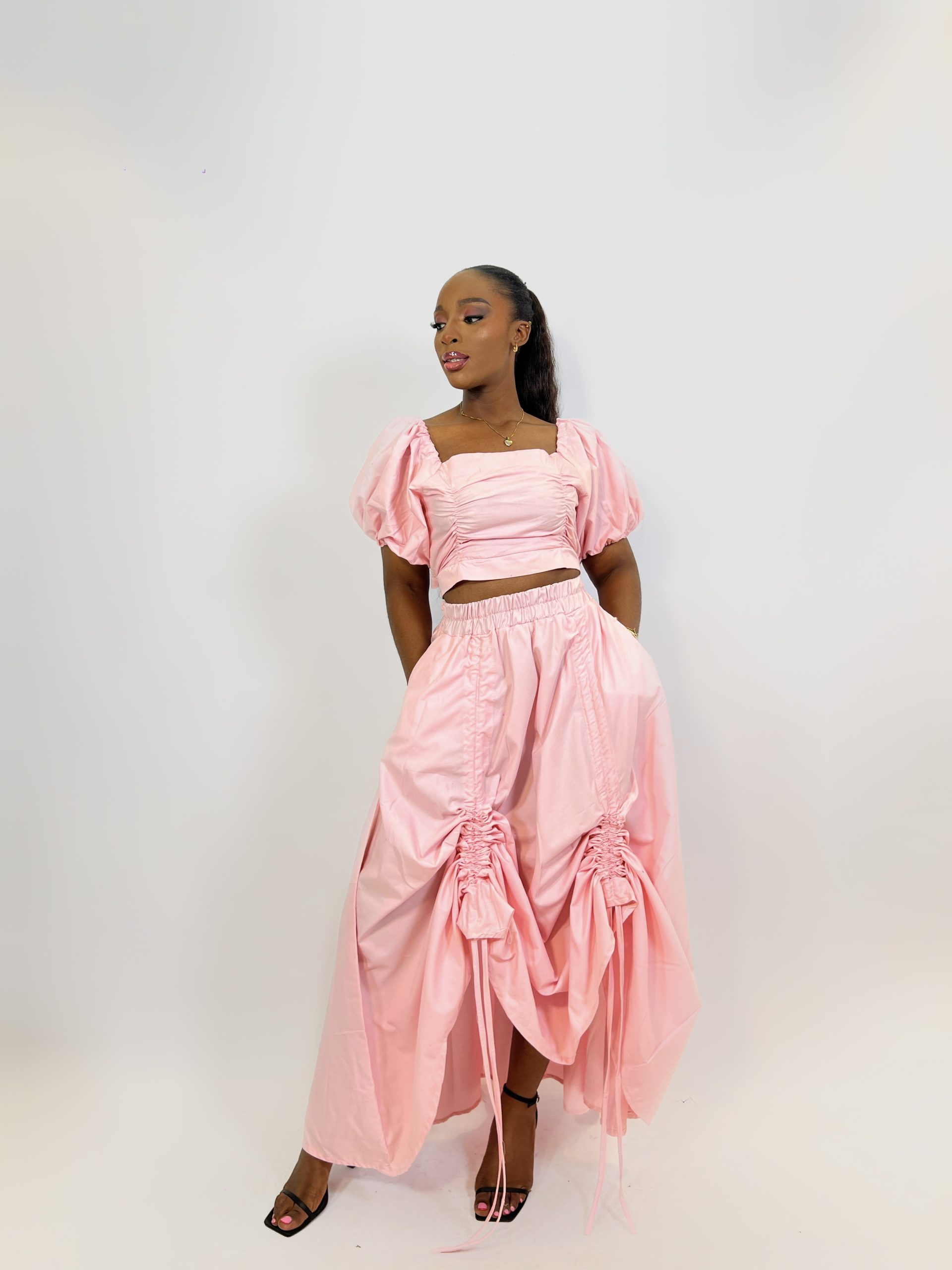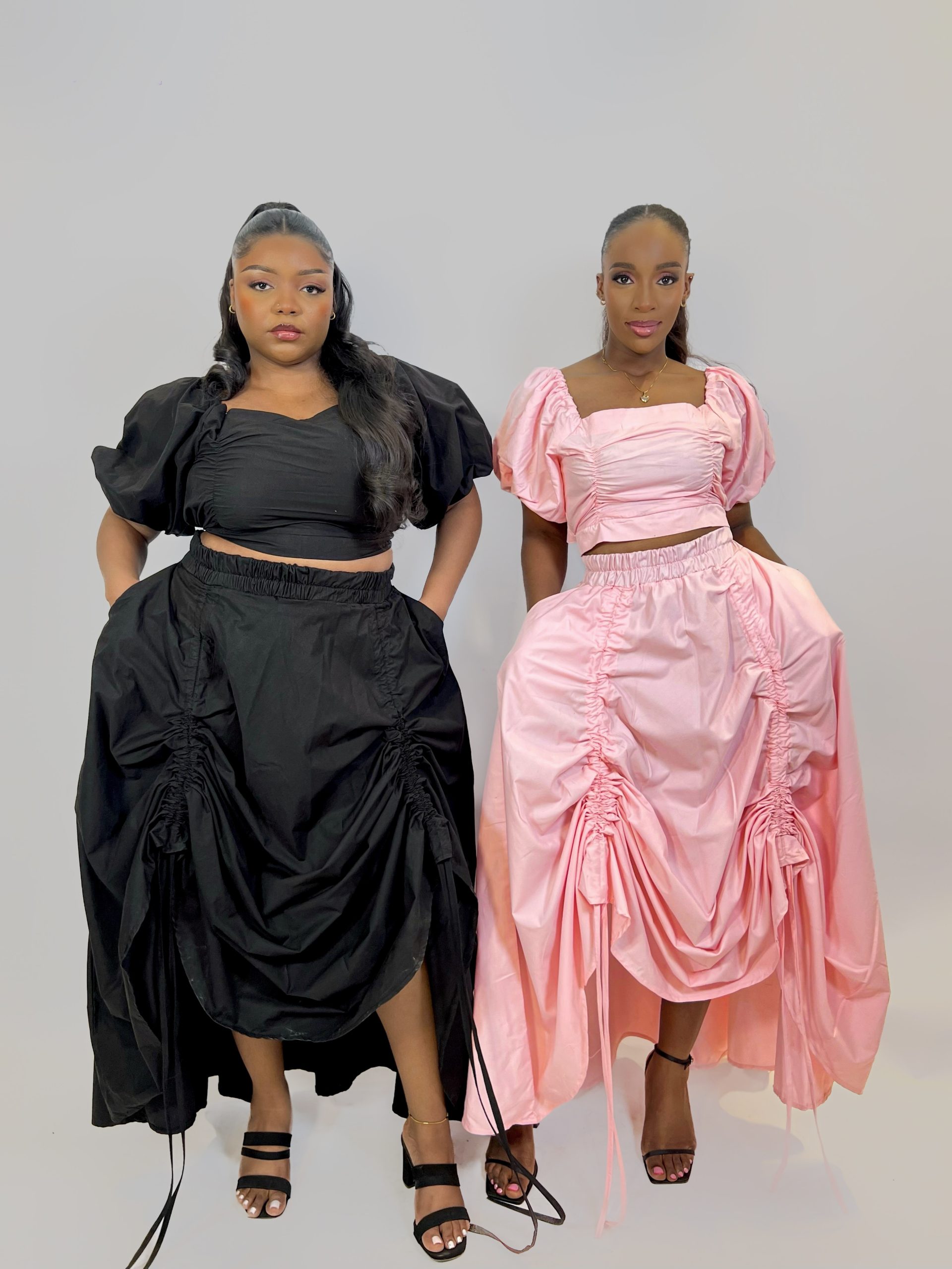 The AHRA Ruched Set is a celebration of form and fluidity. Crafted in rich fabric with a gathered finish, each ensemble features a short puff-sleeved top paired with a voluminous ruched skirt. Adjustable drawstrings create cascading textures that shift with movement, while the fitted bodice anchors the silhouette with quiet confidence. Available in classic black and soft blush pink, AHRA offers dual moods bold elegance and romantic ease.