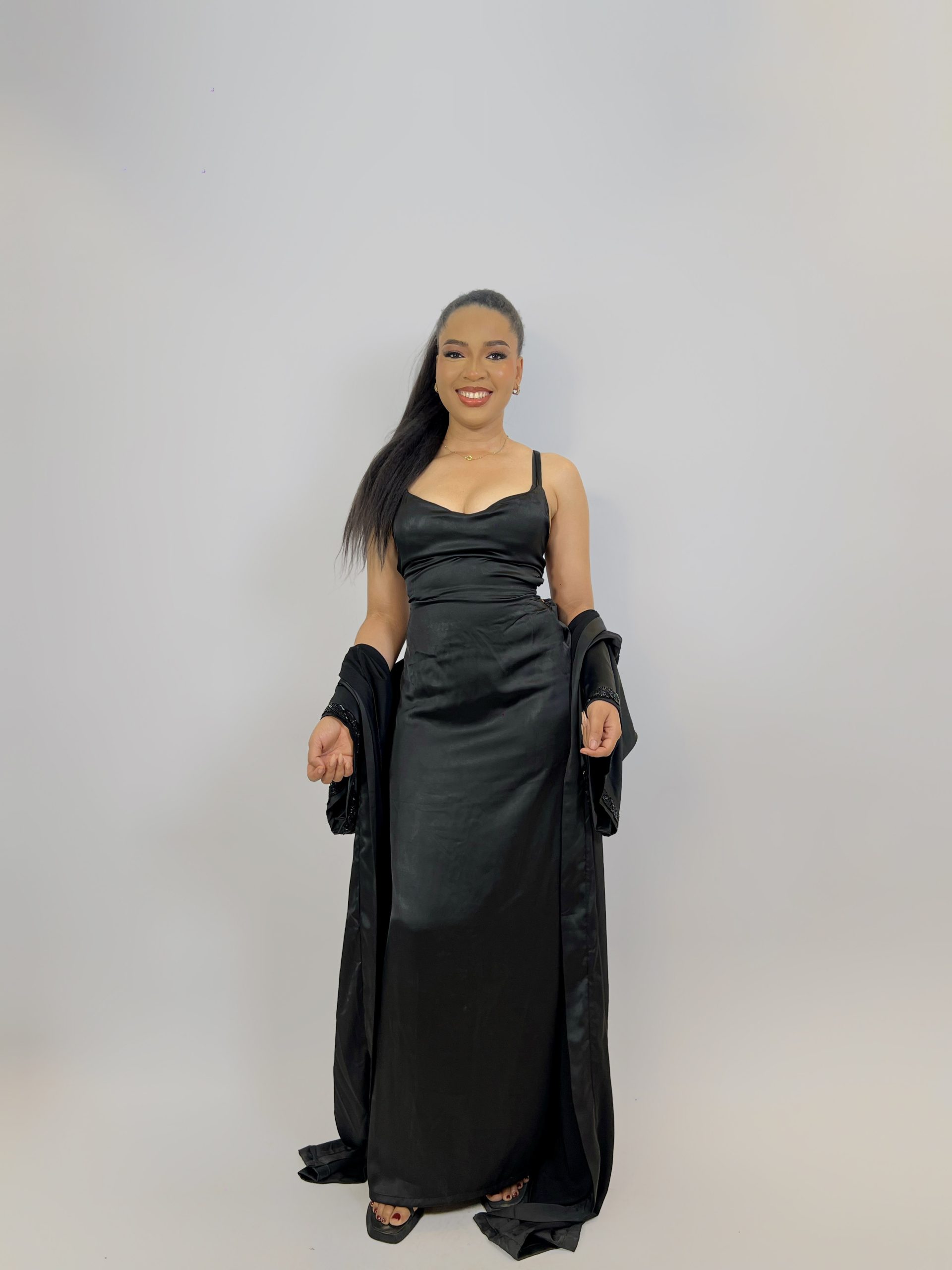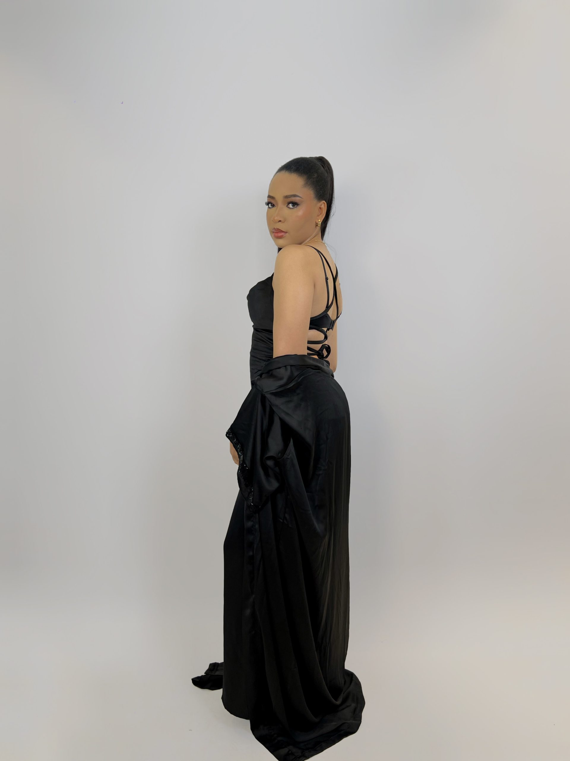 The floor-length gown flows like ink in motion, creating a sense of drama with every step. With its sculptural back and timeless color, AJOKE is for those who speak volumes in silence, turning simplicity into sophistication.