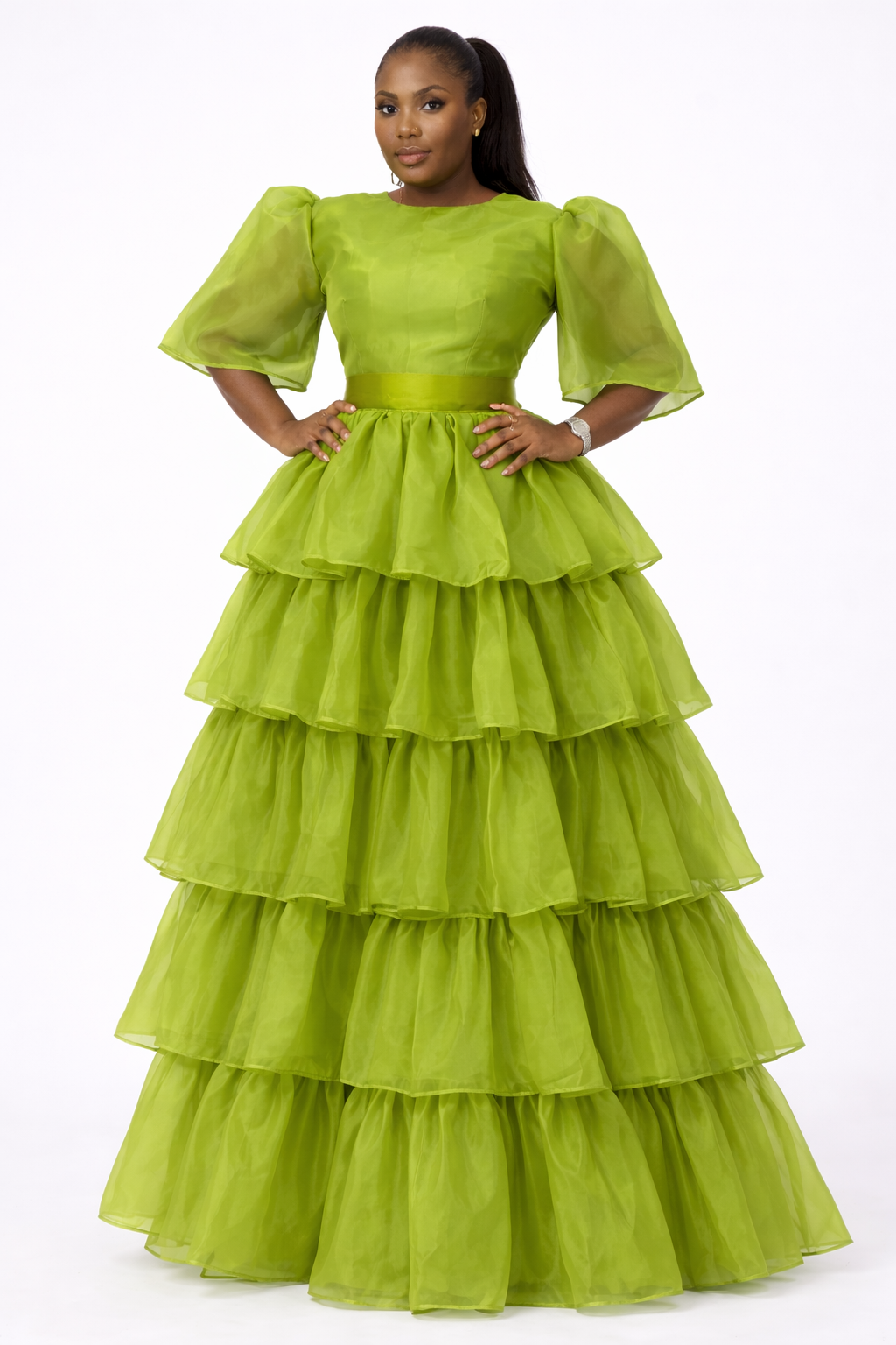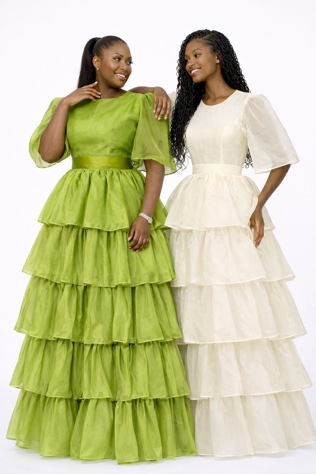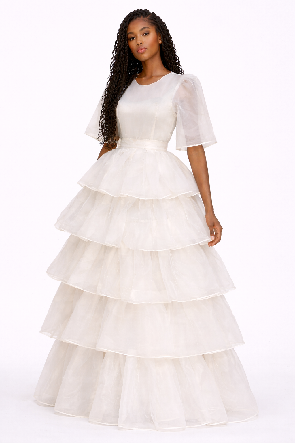 Crafted from light, airy layers, the ALLORA Set floats with every movement, its cascading tiers creating a mesmerizing play of texture and depth. The fitted waistline cinches gently to define the figure, while the full, sweeping skirt brings a sense of fairytale elegance to every step.