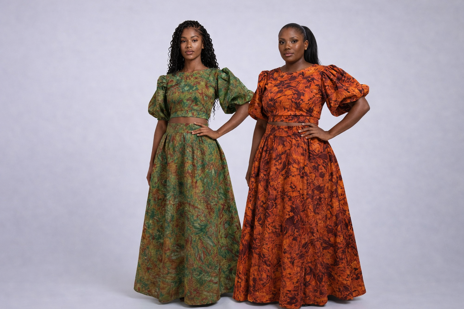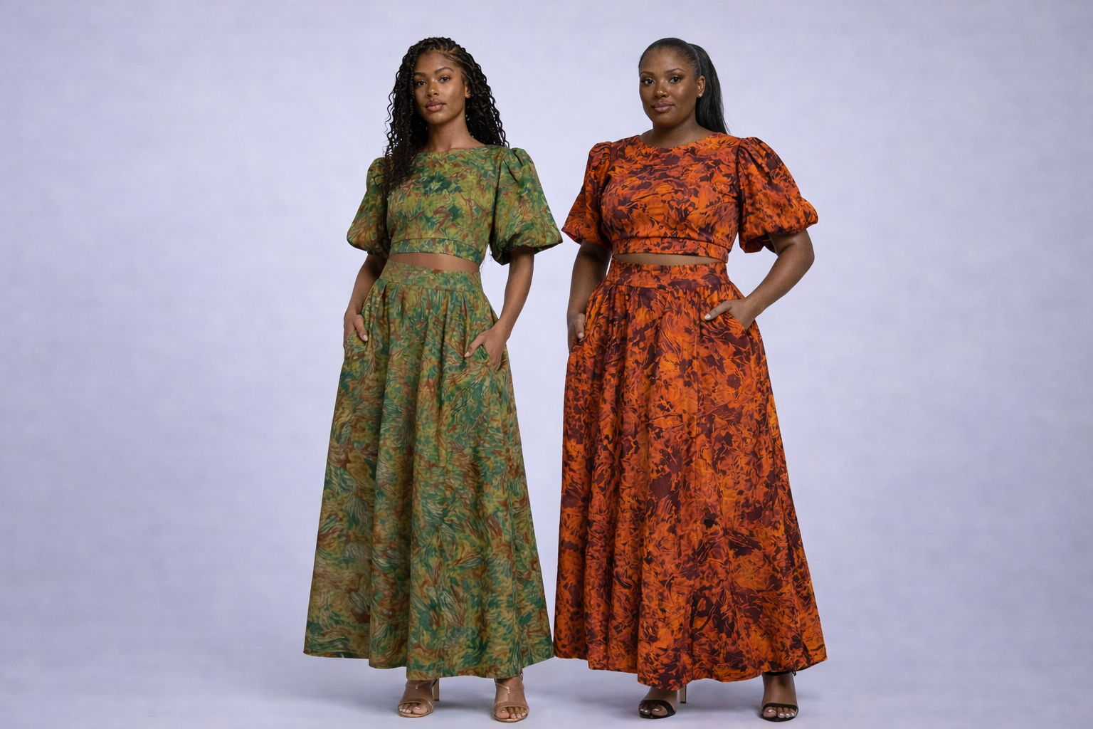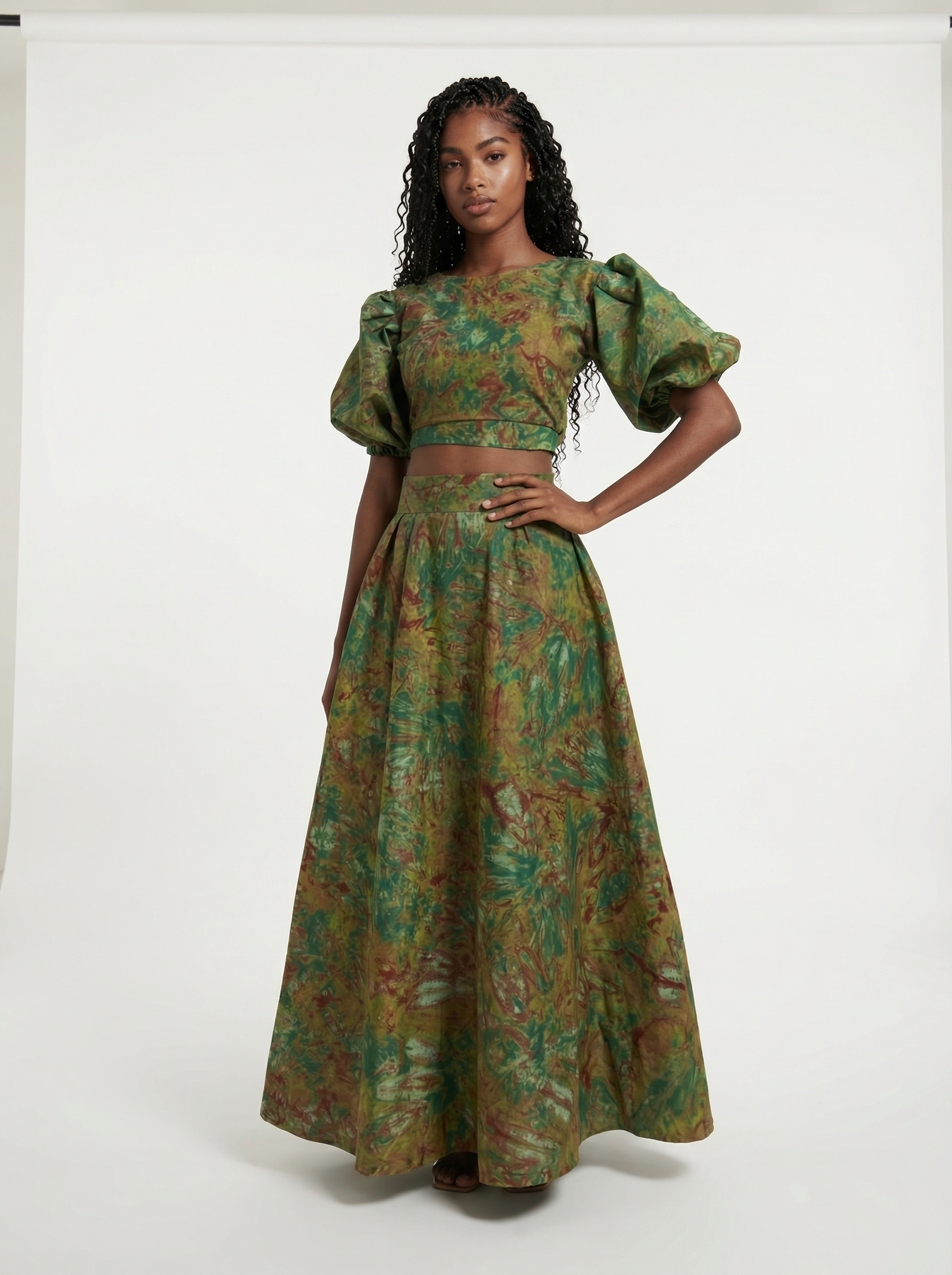 The ANAYA Bloom Set is a celebration of expressive form and refined femininity. Crafted in a textured, breathable fabric, each ensemble features a statement puff-sleeved blouse paired with a softly structured, high-waisted skirt. The marbled brushstroke print layering deep forest greens, golden undertones, and burnt amber hues creates a painterly surface that feels both organic and bold.