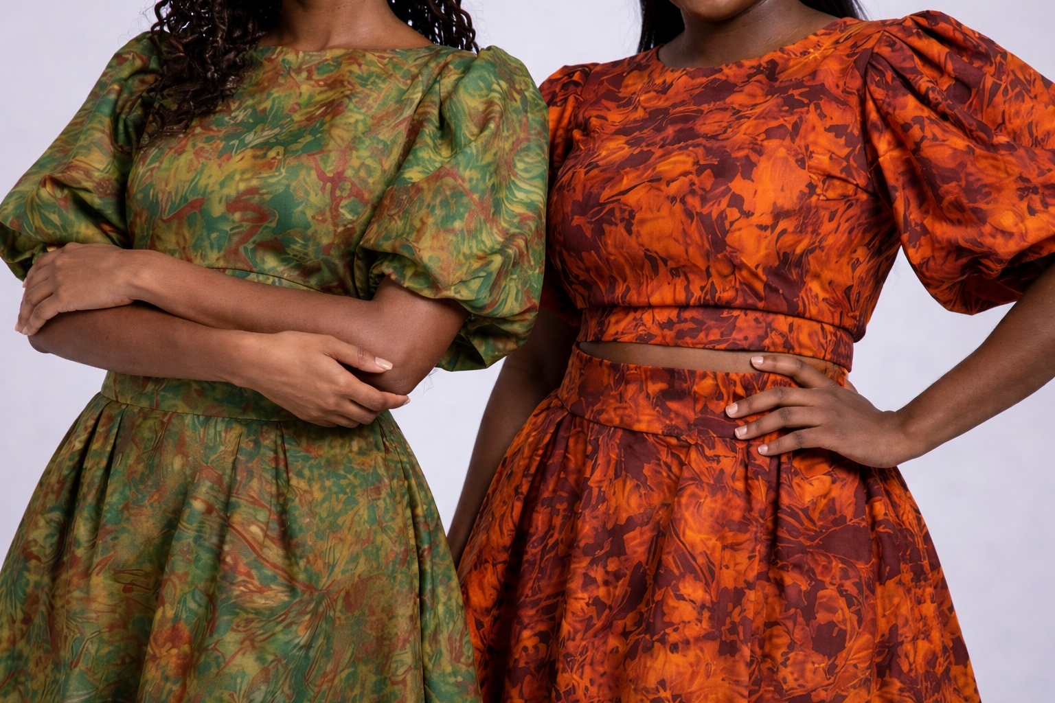A cinched waist enhances the silhouette, while the voluminous sleeves and flowing skirt introduce drama in motion. The interplay of earthy green and fiery orange variations reflects duality calm and intensity, grounding and fire designed to shift effortlessly between moods while maintaining elegance.