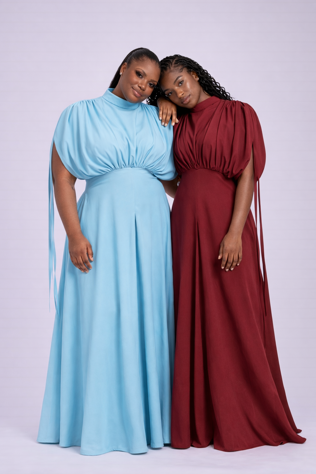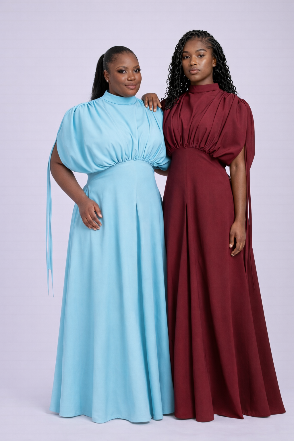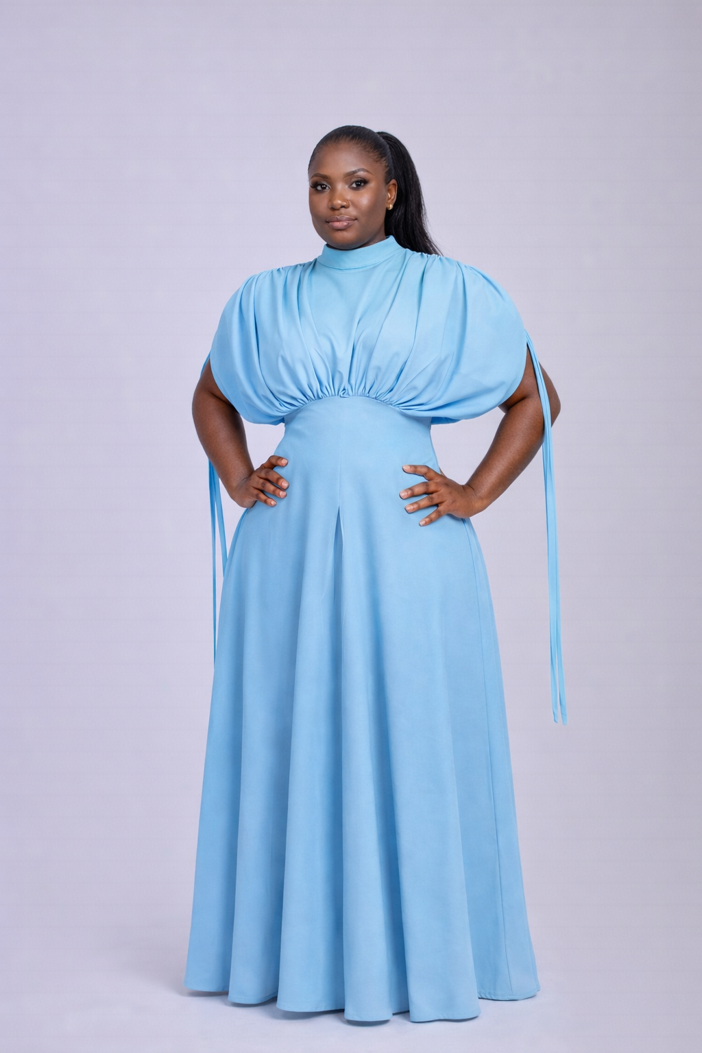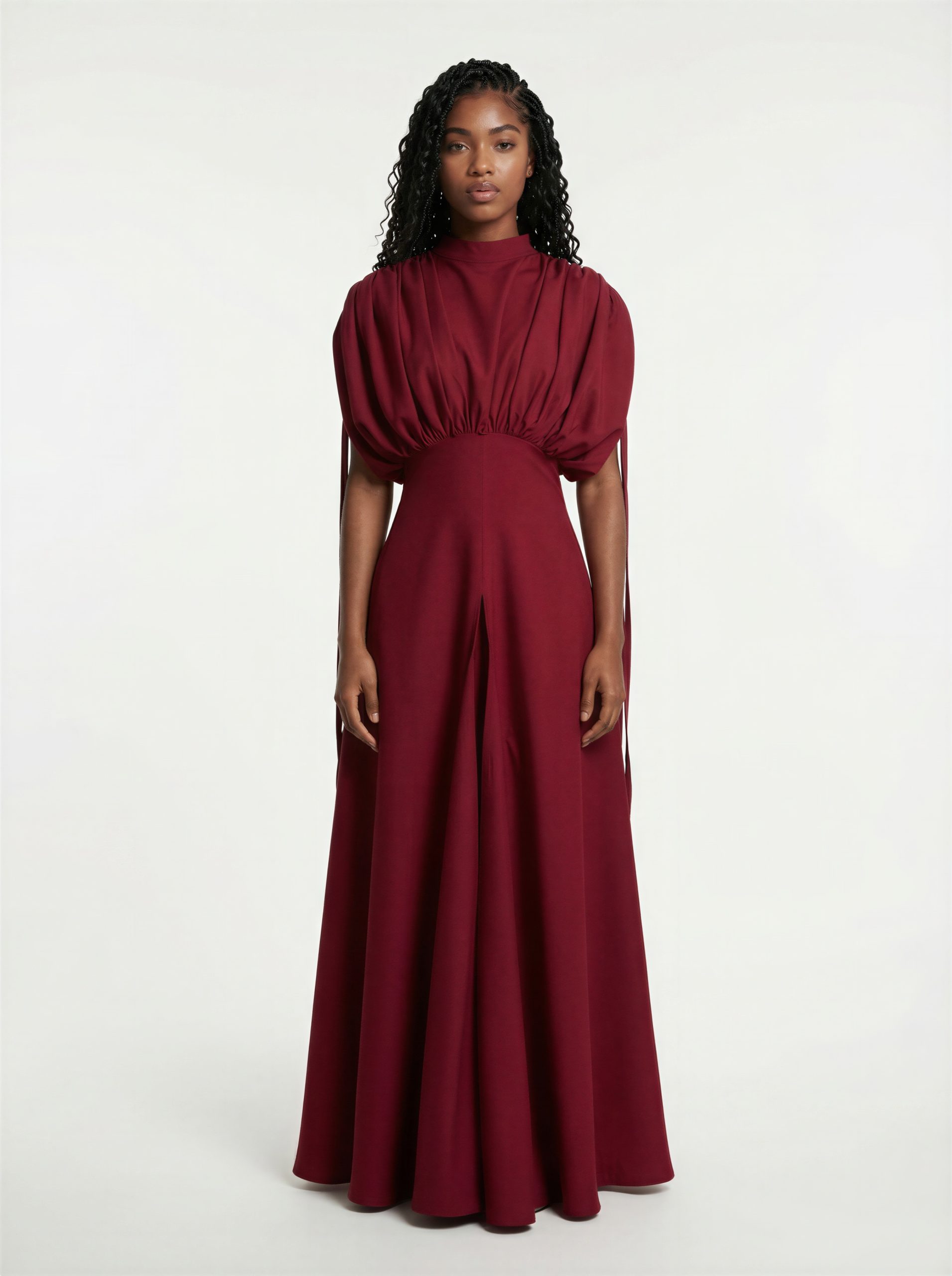 Designed to flatter, the cinched waist defines the silhouette before flowing into a full-length, fluid skirt that moves with quiet drama at every step. The cape-like sleeves add a sense of ethereal movement, blending structure with softness for a look that is both powerful and poised.