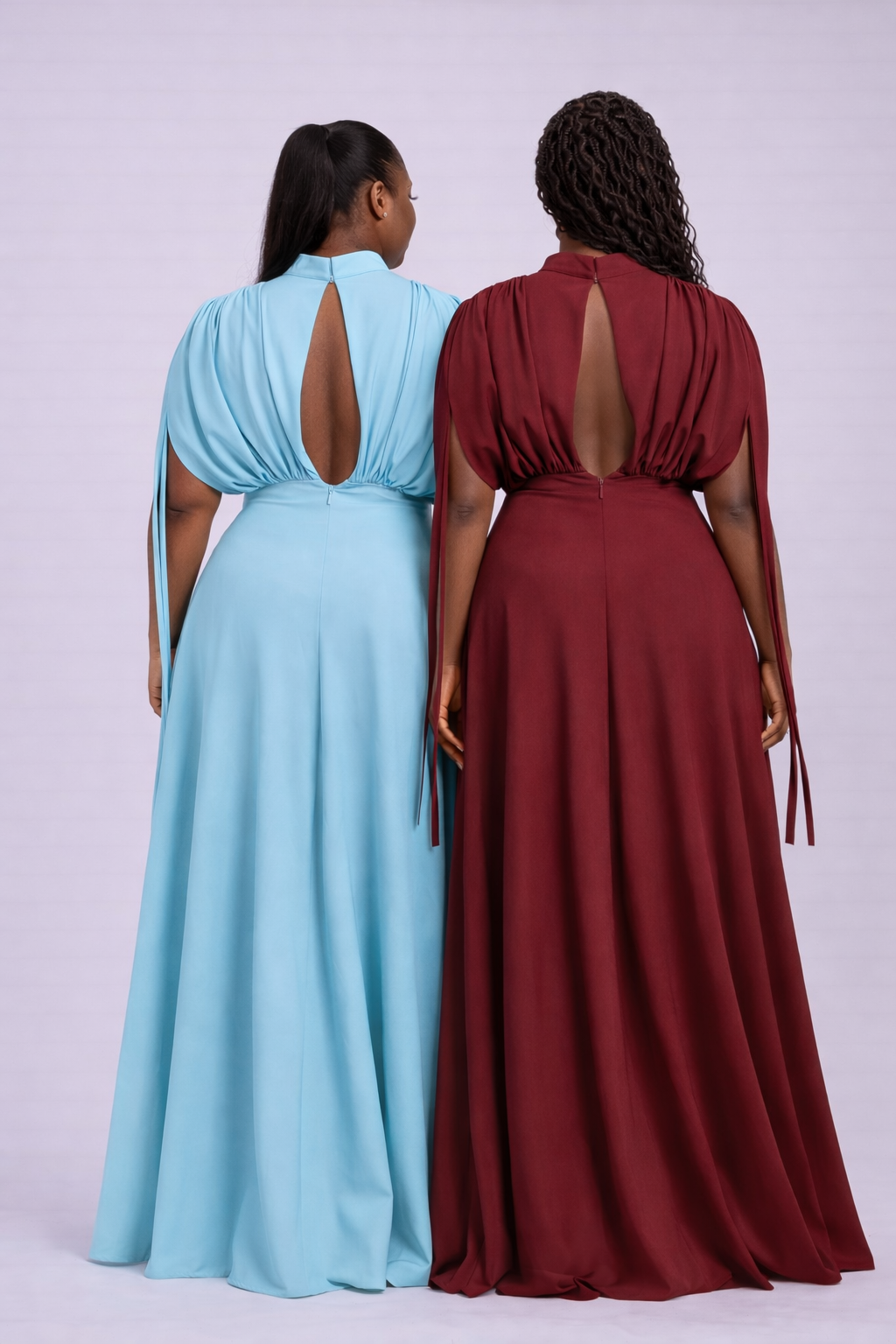 ARIEL FLARE Maxi Dress is the epitome of refined elegance and modern femininity. Rendered in a serene sky blue and wine, it evokes calm confidence and understated sophistication. The high neckline introduces a polished, graceful touch, while the softly gathered bodice creates gentle volume that drapes effortlessly over the frame.