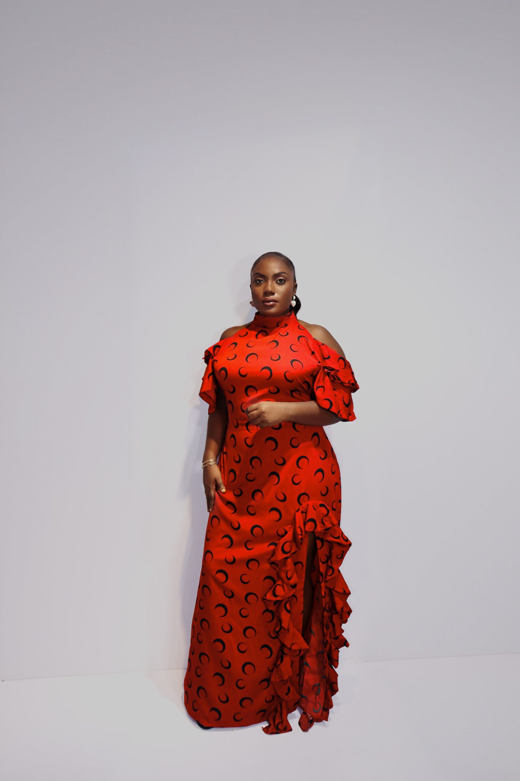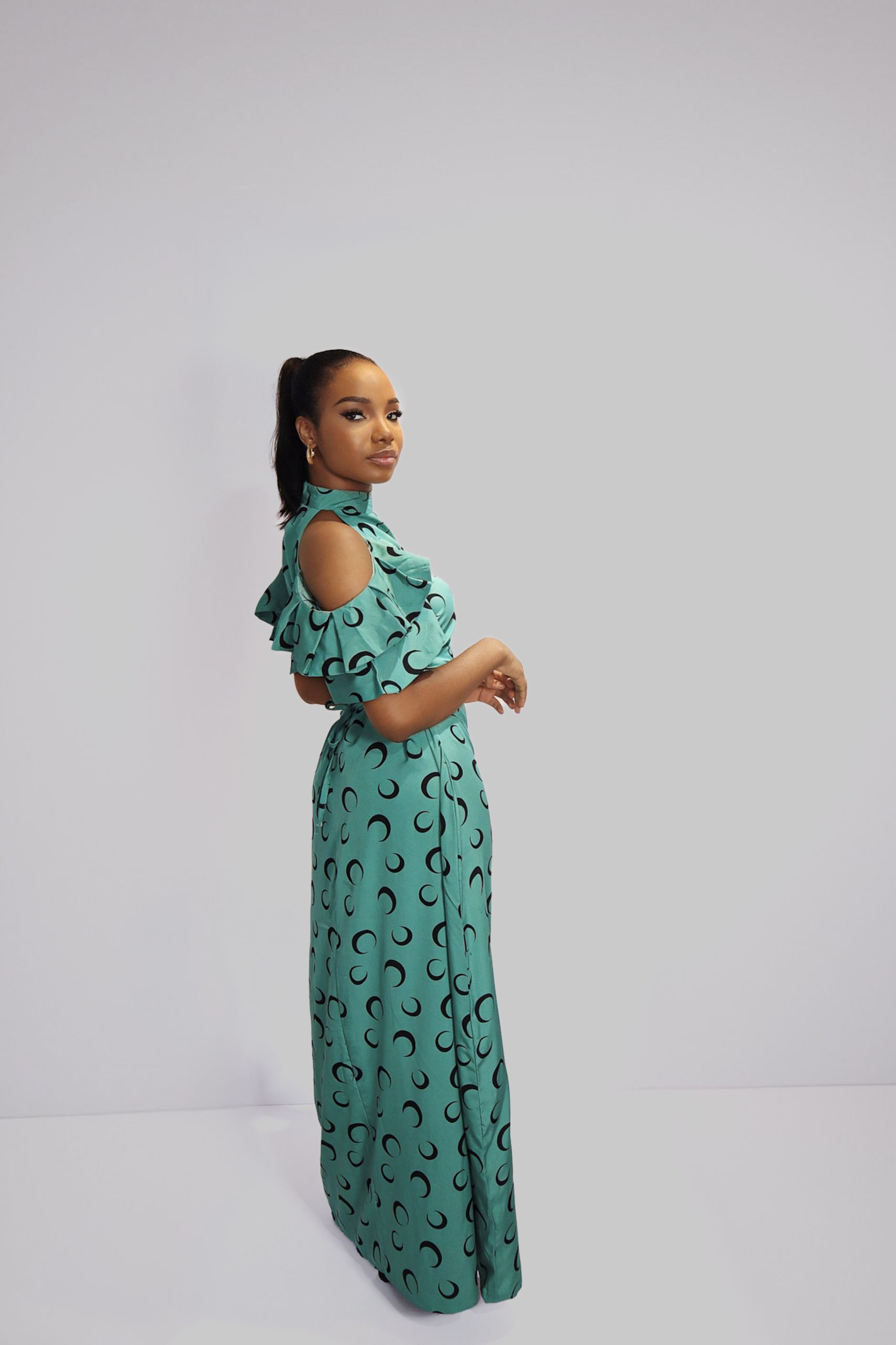 The ARA Crescent Dress is a tribute to fearless femininity and kinetic elegance. Crafted in lightweight mesh with a striking black crescent moon motif, this floor-length design commands attention in vivid turquoise and fiery red palettes. The cold shoulder cut outs and ruffled slit detailing evoke movement and drama, while the fitted bodice sculpts the form with quiet intensity.