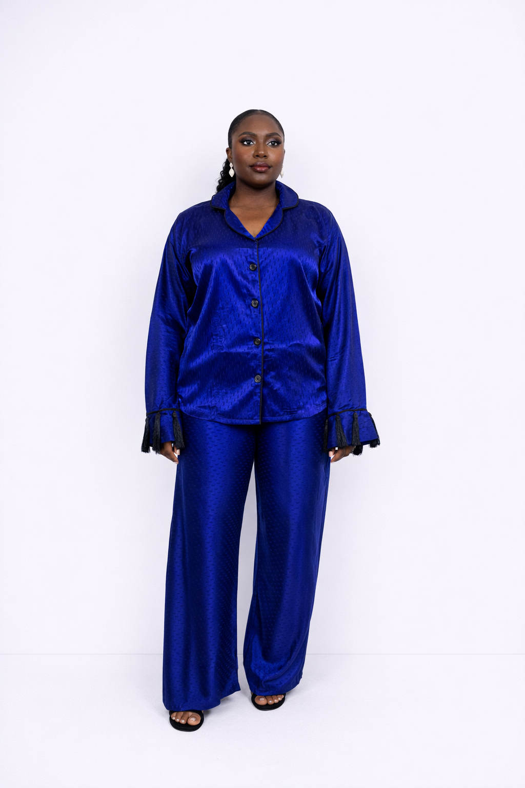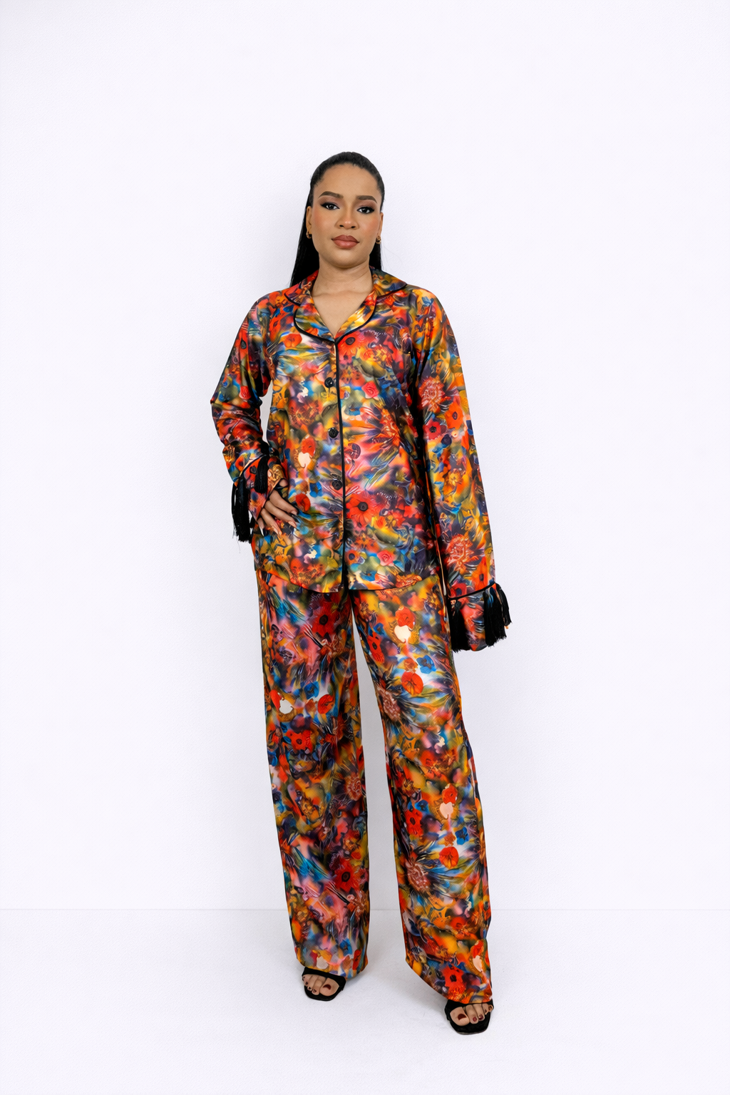 The ASHA Two-Piece set is a celebration of texture, tone, and individuality. Crafted in glossy satin with a soft drape, each ensemble features a button-up top and wide-legged trousers, elevated by delicate black lace trim on the sleeves. The deep blue set exudes moody sophistication, while the vibrant floral print bursts with joyful energy two distinct moods, one unified design language.