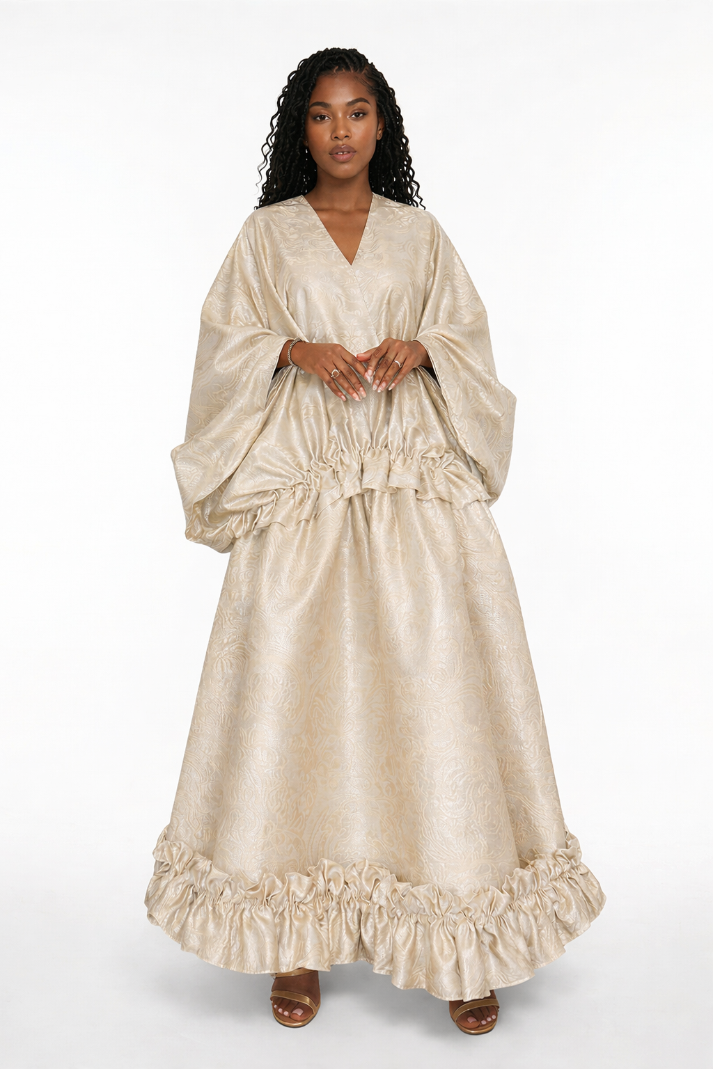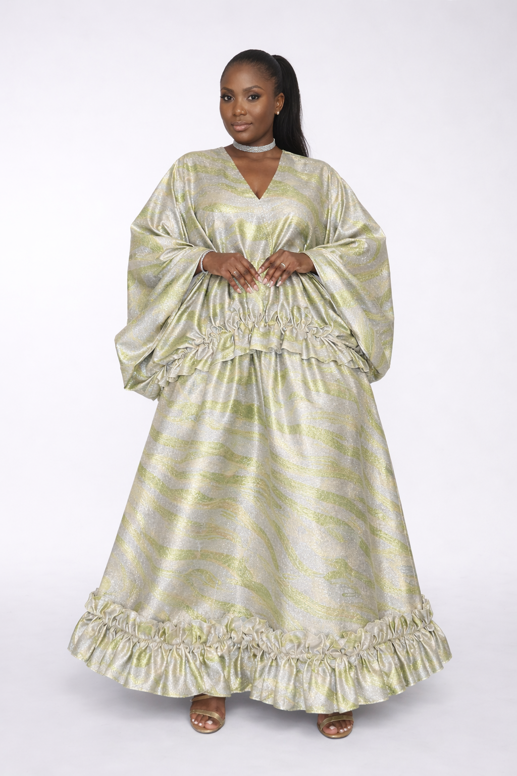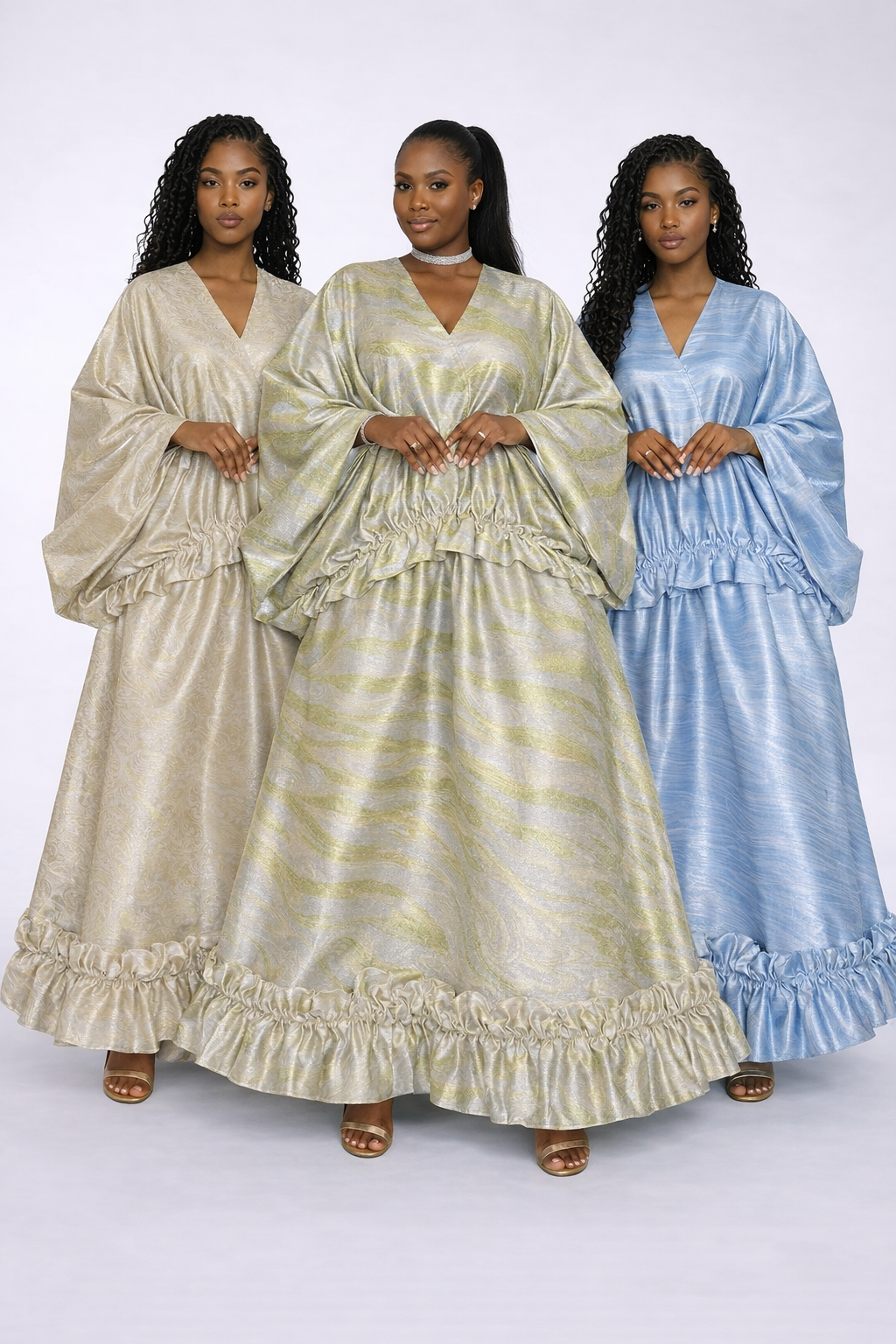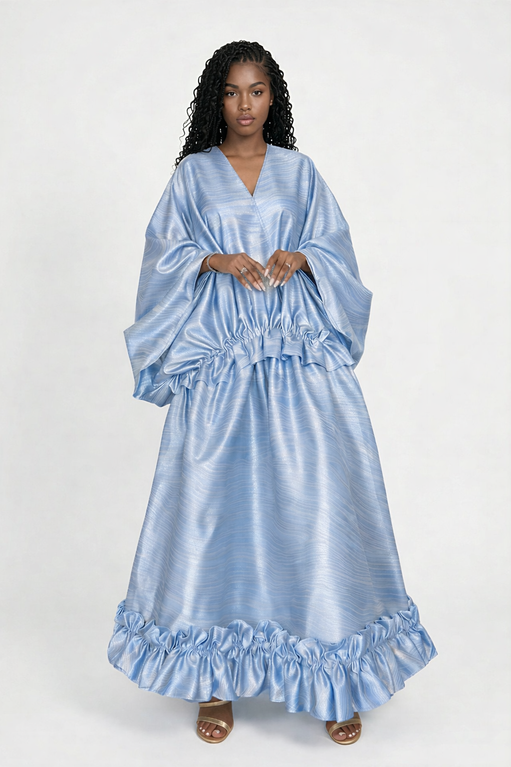 Crafted from lustrous, textured fabric, the AURORA Set catches the light with a soft, radiant sheen, creating a mesmerizing interplay of depth and movement. The flowing bubu top drapes effortlessly over the frame, offering airy volume and a regal silhouette that feels both timeless and refreshingly contemporary. Its gentle gathers and wide sleeves introduce a sense of ease, allowing the fabric to glide with poetic fluidity.