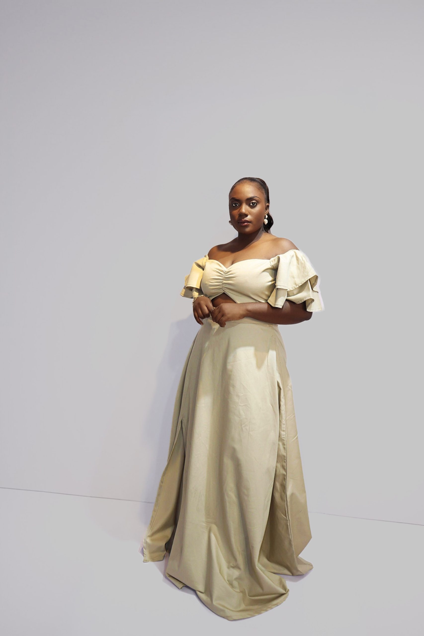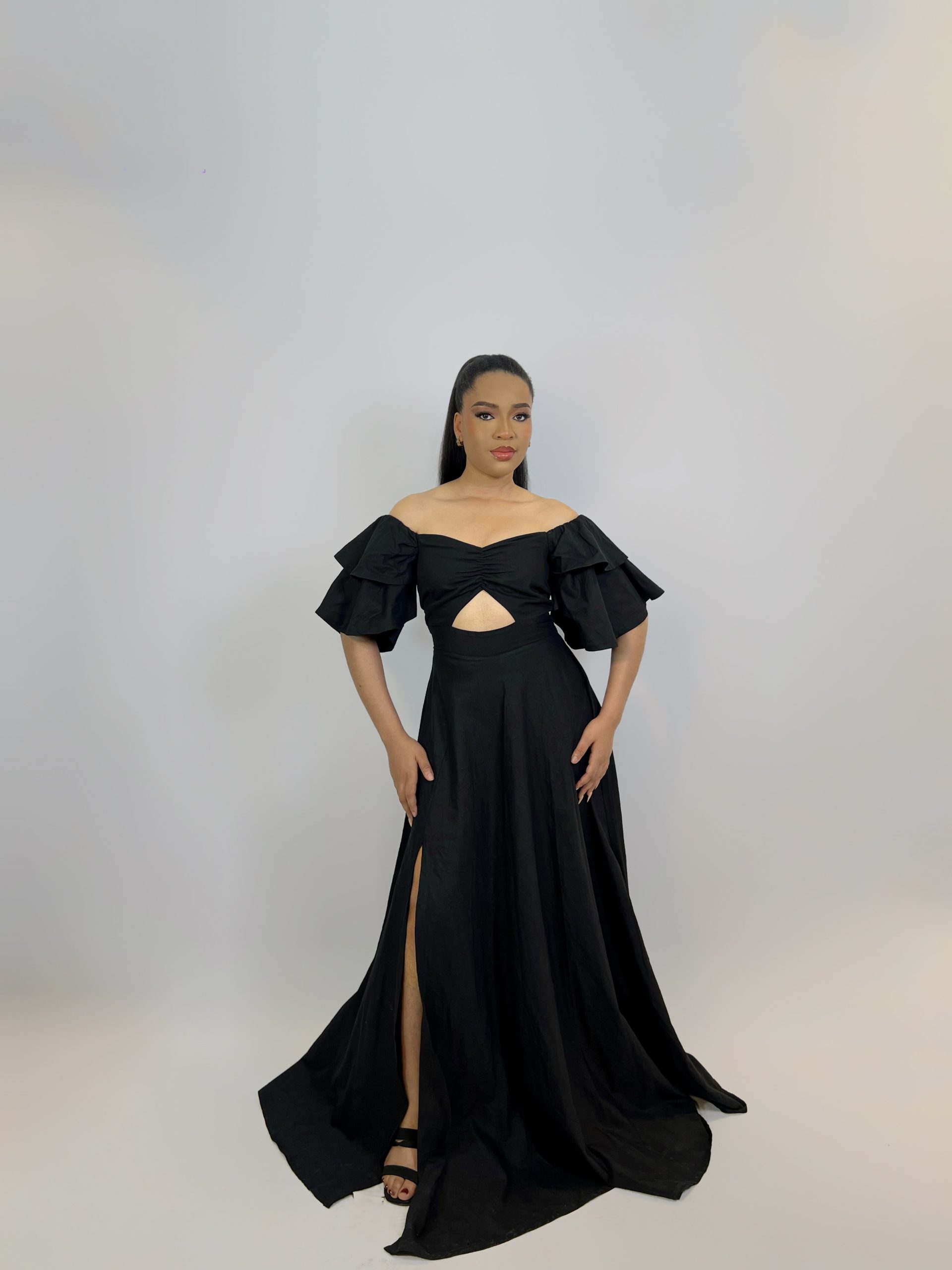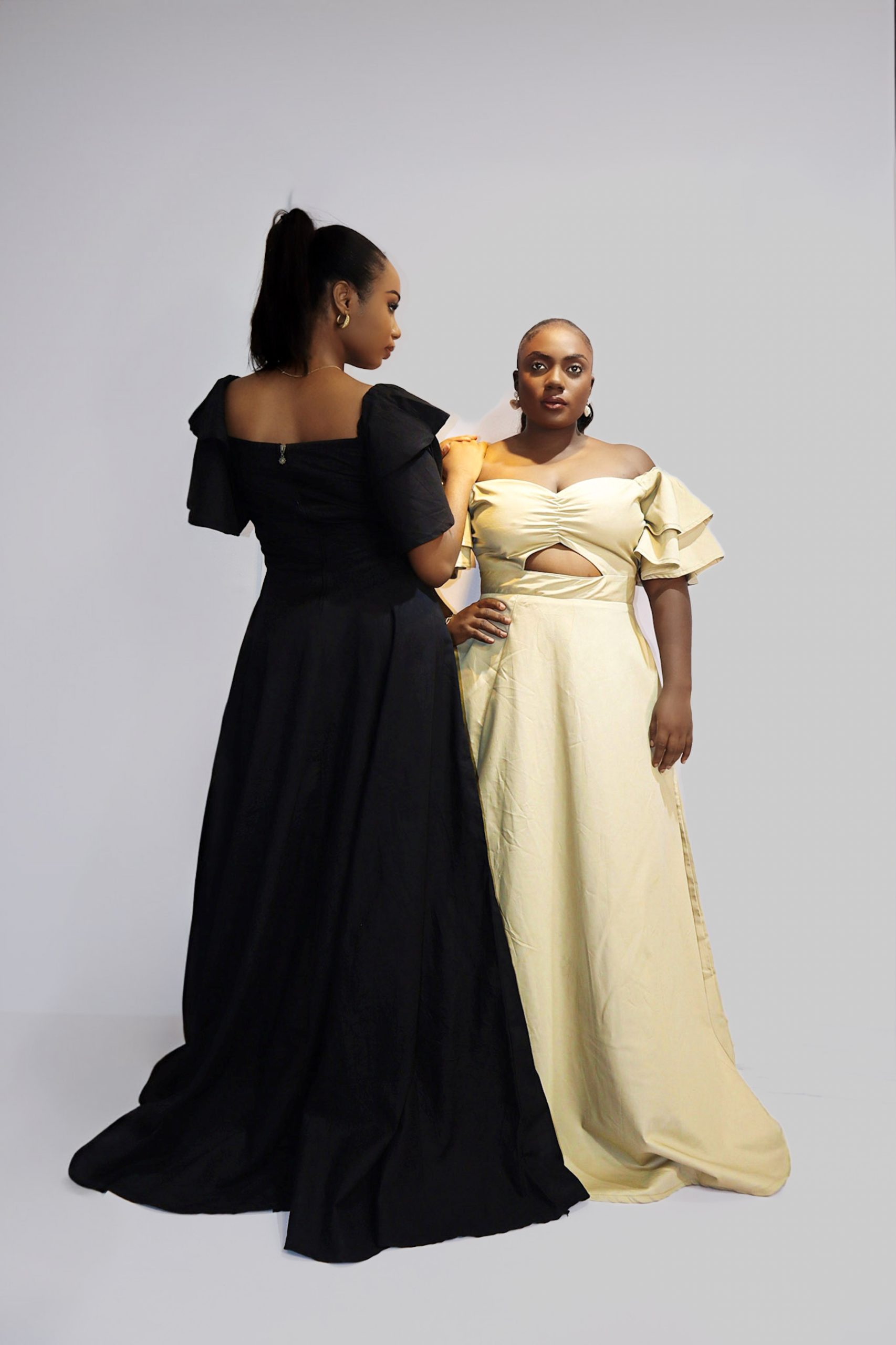 The ADOR Gown is a celebration of contrast. Designed in rich black and soft cream, each gown tells a distinct story mystery and depth versus light and grace. The gown features an off-shoulder neckline with short sleeves and a fitted bodice that flows into a voluminous skirt, midsection cut-out, and a cinched waist that flatters and defines evoking regal simplicity.